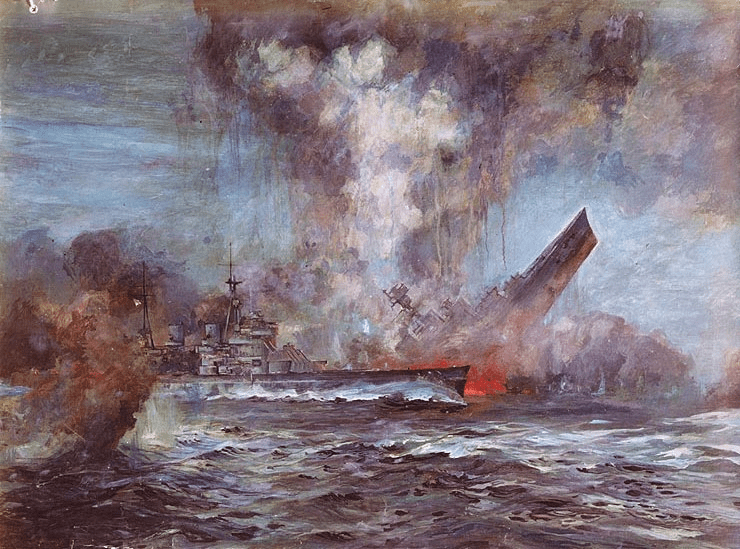 Here is a painting by J.C. Schmitz Westerholdt depicting the sinking of HMS Hood (in the background) beside HMS Prince of Wales (Foreground) during the Battle of Denmark Strait, 24th May 1941.