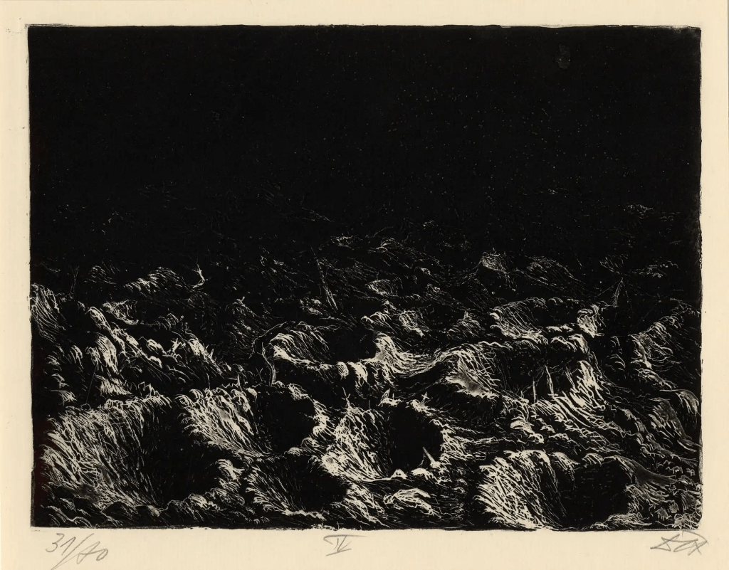 This painting or sketch was drawn by a WW1 German veteran, Otto Dix, as part of his 1924 monumental portfolio “Der Krieg,” showing a vast, barren field pockmarked with artillery shell craters that evokes the vibe of a hellish lunar moonscape. The art captures the grim image of a soldier’s perspective from the trenches. The use of stark contrast between light and shadow captures the desolation, devastation and the unknown that lies beyond the shell craters. Otto Dix, who was an artist and a soldier attached to a machine gun unit in the Western Front, particularly the battle of the Somme, was profoundly compelled by the horrors he experienced: decaying bodies, the screams of his comrades, the hail of machine gunfire, and shells pounding the battlefield. All these elements shape a realistic depiction in his art and later anti-war criticisms, such as the Nazi regime in WW2.