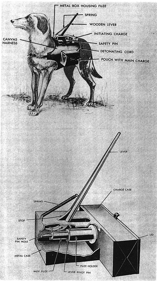 Permitted in 1924, Soviet dogs were often used for military purposes such as delivering messages, tracking mines, and pulling wounded on sleds. However, by 1935, anti-tank dog units were introduced, and various dog breeds like the Alsatian (German Shepherd) were chosen due to their agility, stamina and intelligence. The idea was that the dog would be strictly trained to run under a tank where it would use its teeth to release the strap for the bomb in its harness before running back to its handler. Since the tank’s underbelly is the weaker spot, the bomb will cause severe damage. Below is the sketch showing the breakdown of the anti-tank dog’s gear.