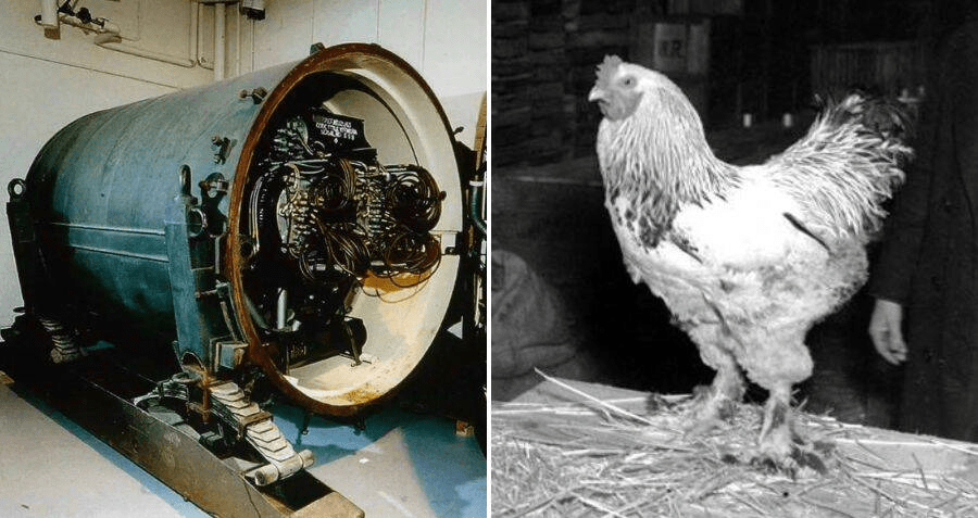 Although two prototypes were built, the operation was scrapped in 1958 due to political and environmental reasons. Maybe sending chickens to their deaths in a radioactive inferno is too cruel to begin with.