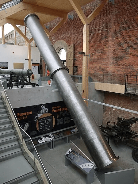 Officially known as Project Babylon, Gerald was paid 25 million dollars by the Iraqi government to design a true supergun on the condition that he would work on their artillery. The project would see the construction of multiple “Baby Babylon” guns each measuring 147 feet with a caliber of 13.8 inches but ultimate goal, was the two mighty “Big Babylon” guns which measured 512 feet long with a massive 39 inch bore capable of not only launching a 440 Ib satellite into an orbital trajectory but also fired a 1300 Ib projectile at a vast distance of over 620 miles.